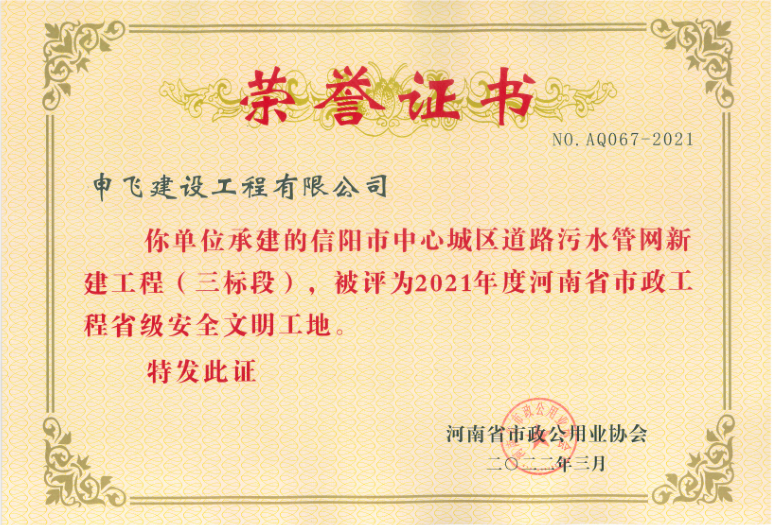 信陽(yáng)市申飛市政工程有限公司原名信陽(yáng)市市政工程公司,注冊(cè)資本1.1億元。公司目前擁有“市政公用工程總承包一級(jí)、市政設(shè)計(jì)乙級(jí)、房屋建筑總承包三級(jí)、環(huán)保三級(jí)、機(jī)電安裝三級(jí)、裝飾裝修三級(jí)、鋼結(jié)構(gòu)三級(jí)”等多項(xiàng)企業(yè)資質(zhì)。公司下設(shè)設(shè)計(jì)公司、物業(yè)公司、商品砼公司等多個(gè)子公司。業(yè)務(wù)范圍包括市政工程設(shè)施管理,城市道路、橋梁和隧道施工、維護(hù),城市給水、排水設(shè)施施工及維護(hù),城市道路、橋涵測(cè)量、設(shè)計(jì),建筑工程,燃?xì)鉄崃?、垃圾處理,預(yù)制構(gòu)件,建筑垃圾運(yùn)輸、處置、加工再利用,園林工程,商品砼的生產(chǎn)與銷(xiāo)售等。